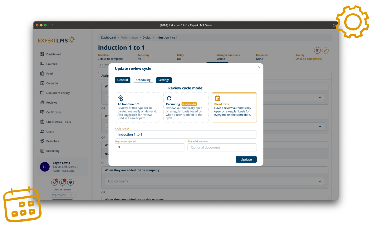 Streamline employee evaluations with a performance review system built directly into your LMS. Automatically trigger appraisals for individuals based on job role, departments, or branches. Gather structured feedback from both managers and staff. By combining reporting, goal-setting, and flexible scheduling, you can make reviews meaningful, consistent, and actionable all in one place.